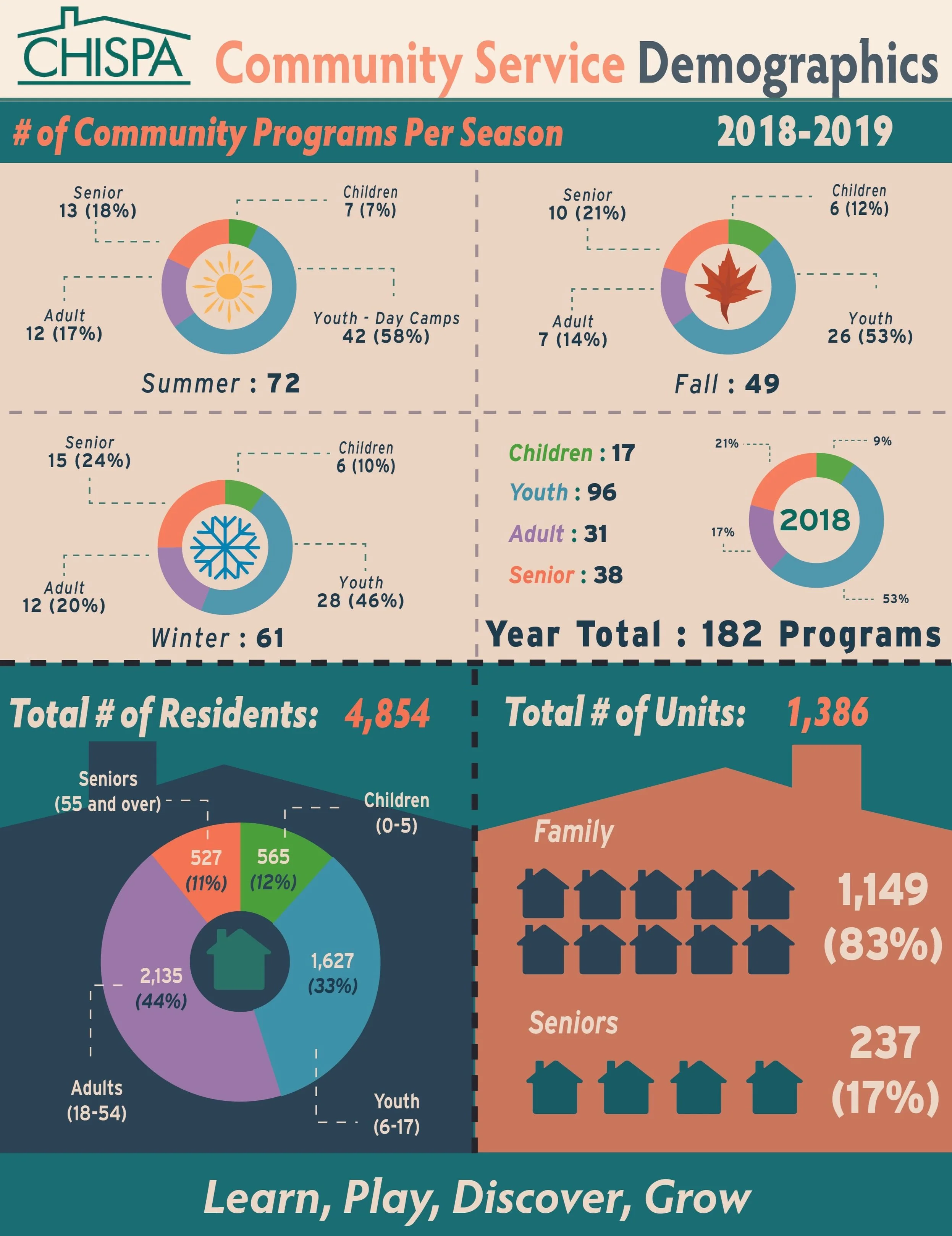 Infographic created for CHISPA Housing, the largest private, nonprofit housing developer in Monterey County. In addition to housing opportunities, CHISPA provides residents with community programs, such as after-school activities, senior exercise classes, and access to food banks.